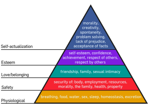 What Maslow developed was a theory that aimed to explain human motivations towards peak experiences. Why do some people aim for excellence and actually achieve satisfying results? Most people languish in a state of unfulfilled potential despite having a sense of motivation towards certain goals in life. He developed a hierarchy of needs, depicted with a pyramid in most expositions of his model. The five levels begin at the base with physiological needs like food and shelter. Above this are safety needs such as job security. He identifies love and belonging as the next level, which includes family and friendship. Esteem is the penultimate level including concepts such as respect, status and recognition. Finally the tip of the pyramid is self-actualization where an individual achieves meaningful goals. Maslow did not consider that one progress linearly through this hierarchy, nor that the categories were rigid. Multiple levels of needs can be satisfied, for instance, by landing a job that fulfills physiological and safety needs while also being an achievement of one’s potential.