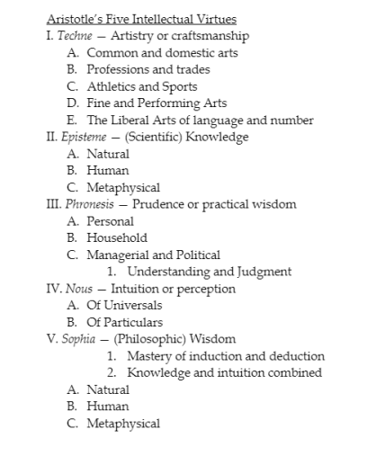 In the following outline, I detail a number of subheadings under Aristotle’s intellectual virtues as listed and explained in Book VI of his Nicomachean Ethics. While there are a number of ways I will need to explain Aristotle’s intellectual virtues as the proper goals of a classical Christian educational program, the main point for our present purposes is to draw attention to what Bloom’s Taxonomy left out or sidelined.