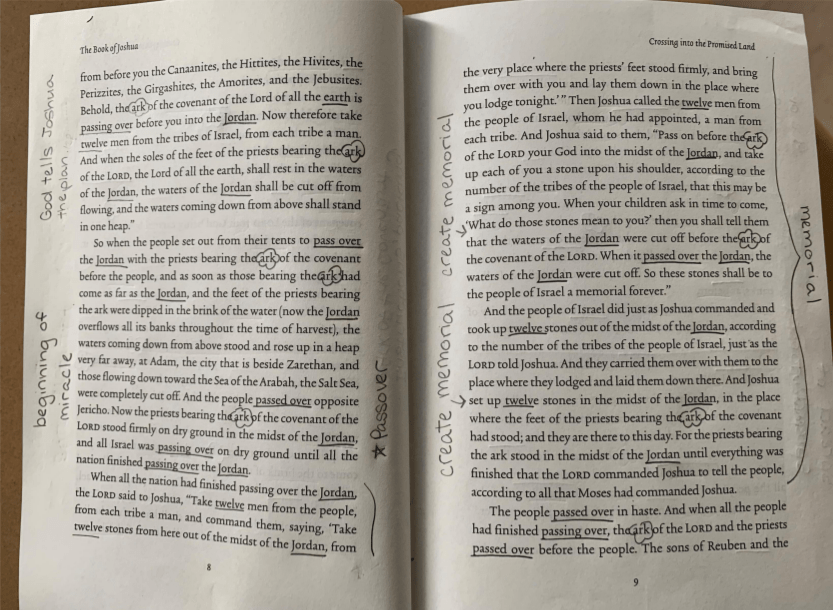 Recurring words and images create through-lines across the Bible. Teach students to listen for repeated ideas, even if they don’t use the exact same word, and even if they seem like a minor concrete detail. These details will add up to a richer, more beautiful story when we keep track of them. But because motifs lie under the surface, we have to act like detectives. Have you heard repetition and wondered, “Is this a whole-Bible motif?” Check a scholarly work like the Dictionary of Biblical Imagery. Then do some thinking: What would this image mean to ancient people? Where did we see this motif earlier? Does it run all the way from Genesis to Revelation?