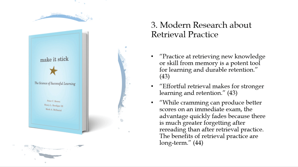 Comenius begins by claiming that “the more anything is handled, the more familiar it becomes; consequently, if we would have our students well acquainted with anything and ready to use it, we must familiarize them with it through reviews, examinations, and frequent use” (191). He goes on to say that these “reviews and examinations” should occur “even during the process of learning”. Comenius reinforces the importance of continual review and testing through the analogy of a traveler becoming acquainted with a road through the process of going backward and forward on it, retracing his steps through narration, and then digressing along different alternate routes along the way (191-192).
