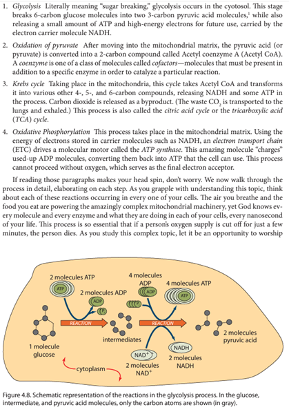 Looking at this passage, you can see how the text already breaks the content down to small and accessible episodes. I would provide a “small talk” by listing the four reactions on the board. We would read carefully and closely the first paragraph one time and then turn the book over. My narration cue would be simply to say, “tell me what you recall about glycolysis.” One student might share that it means “sugar breaking” and that a small amount of ATP is released. Then I call for another student to add more to the picture, and that student says that a six-carbon molecule is broken down into a 3-carbon molecule. Another student might say that an electron is carried by a molecule, but can’t remember the name. Then the first student remembers that it was a NADH molecule. By this point, much of the paragraph has been narrated by what we would call a string narration. Now I can have the text turned back over, and I ask the students, “what did we miss?” They can see that the 6-carbon molecule is a glucose molecule and the 3-carbon molecule is an acid. In a few minutes we have accomplished a great deal to assimilate the knowledge of glycolysis and can move to oxidation of pyruvate.